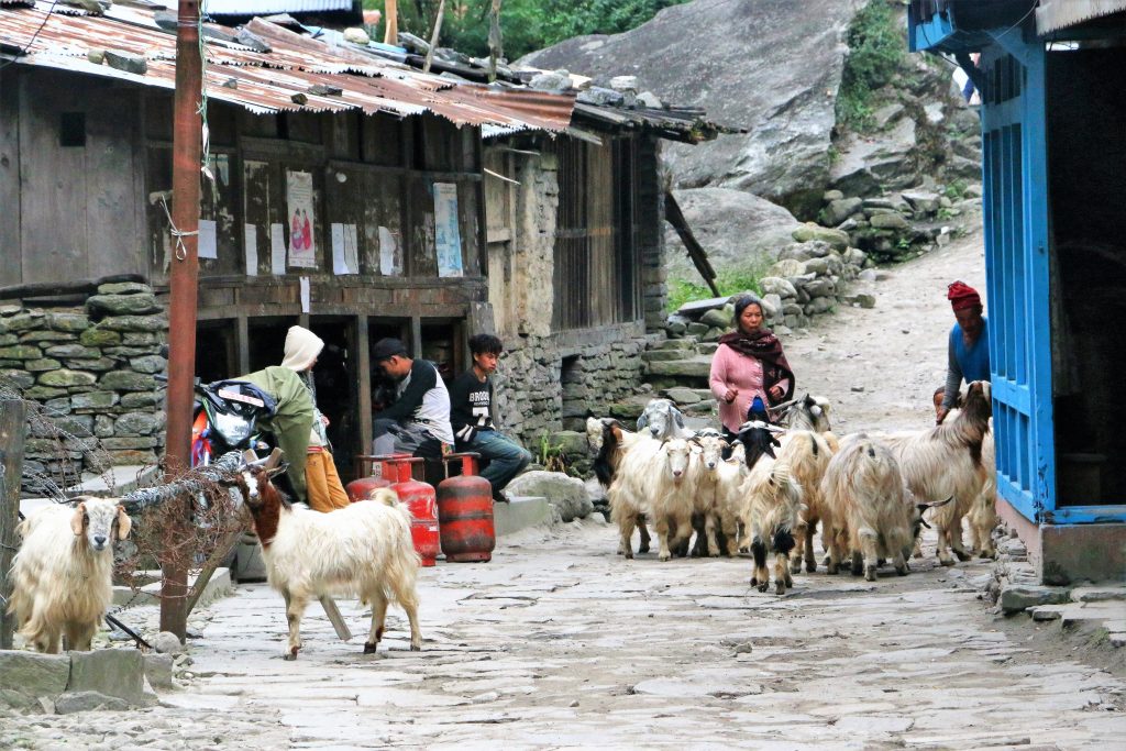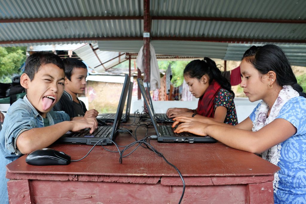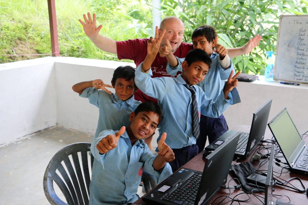Teil meines Plans war es, neue Erfahrungen im Rahmen sozialen Engagements zu sammeln. Meinen Kenntnissen als IT-Fachmann folgend, fand ich eine Möglichkeit zwei auf dem Land gelegene Schulen mit Computern auszustatten und den Unterricht zu gestalten. Nach einer Busfahrt und vierstündigem Fußmarsch in strömendem Regen, durch Bäche und vorbei an zahlreichen Wasserfällen erreichte ich den Ort Gaujini, nur 40 Kilometer nordöstlich von Kathmandu. Trotz Einbruch der Nacht machte ich mich, ausgerüstet mit meiner Stirnlampe, auf den kurzen Weg zum Bach, um mir dort nach den Strapazen eine erfrischende Dusche zu gönnen. Die ohrenbetäubende Lautstärke der Grillen war beeindruckend, wurde jedoch bei Nacht durch den prasselnden Regen auf das Wellblechdach meines Tunnelhauses sogar übertönt. Nach einer mehr oder weniger erholsamen Nacht fanden sich die ersten Schüler erwartungsvoll zum Unterricht ein. Die anfänglichen Berührungsängste wurden durch Neugierde sowie durch Freude am Üben abgelöst. Besonderen Ehrgeiz entwickelten Groß (die Lehrer) und Klein beim Balloon Game: Durch die schnelle und korrekte Eingabe vorgegebener Wörter konnten virtuelle Luftballons zum Platzen gebracht werden. Tags darauf wird ein lautes Klopfen an das Wellblechdach meiner Hütte von hellen Stimmen begleitet, die laut rufen: „Sir, Computer-Class Sir!“. Die Schüler waren mit voller Begeisterung dabei – eine schöne Bestätigung. Die Herausforderung, regelmäßige Stromausfälle mit Spielen und Zaubertricks zu überbrücken, nahm ich sehr gerne an. Eine Kampfansage der anderen Art machten uns Ziegen, die ähnlich hoch motiviert wie die Kids zum Unterricht erschienen, jedoch Geschmack an den leckeren Stromkabeln gefunden hatten. Wir verlegten die Kabel neu und einigten uns auf Unentschieden …