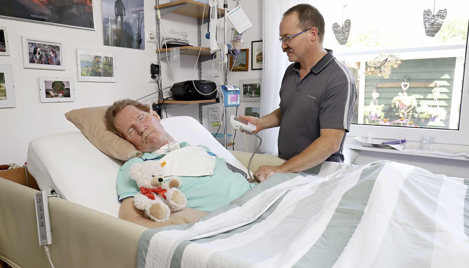 Patienten wie Günter Ritz mit chronischem apallischen Syndrom, auch Wachkoma genannt, sind üblicherweise in Langzeitpflegeeinrichtungen untergebracht, oder sie werden, wenn das Engagement und die organisatorischen Möglichkeiten von Seiten der Angehörigen gegeben sind und sich ein guter Intensivpflegedienst findet, zu Hause in der Familie versorgt. Der Zustand Wachkoma, auch apallischer Zustand genannt, leitet sich ab aus dem lateinischen „apallium“ (ohne Mantel, ohne Großhirnrinde) und soll sagen das der, für unser Mensch sein alles ausmachende, Großhirnbereich aufgrund ei- ner Schädigung auf Dauer nicht mehr funktionsfähig ist. Für Anita Ritz, gelernte Kinderkrankenschwester war immer klar: „Ich hole meinen Mann nach Hause!“ Seit 43 Jahren ist das Paar ein Team mit einer ganz star- ken Verbindung. Es war im Januar 2015, da habe ihr Mann plötzlich über Kopfschmerzen geklagt, nach zwei Tagen fuhren sie in die Klinik. Ein Abszess im Gehirn lautete die Diagnose. Operationen folgten und nach ihnen in schneller Folge schwere Komplikationen. An seinem 60. Geburtstag fiel er ins Koma. „Du bist die Liebe meines Lebens.“ Das sei sein letzter Satz gewesen. Für Anita Ritz Botschaft und Auftrag in einem. Hermine Moser, Leiterin des Pflegedienstes, betreute den Patienten von Anfang an. Und nun im häuslichen Umfeld, da jeder Patient frei wählen könne, wo er betreut wird. „Wir geben nie auf“, das sei immer ihr Leitspruch gewesen, so die Angehörige.
