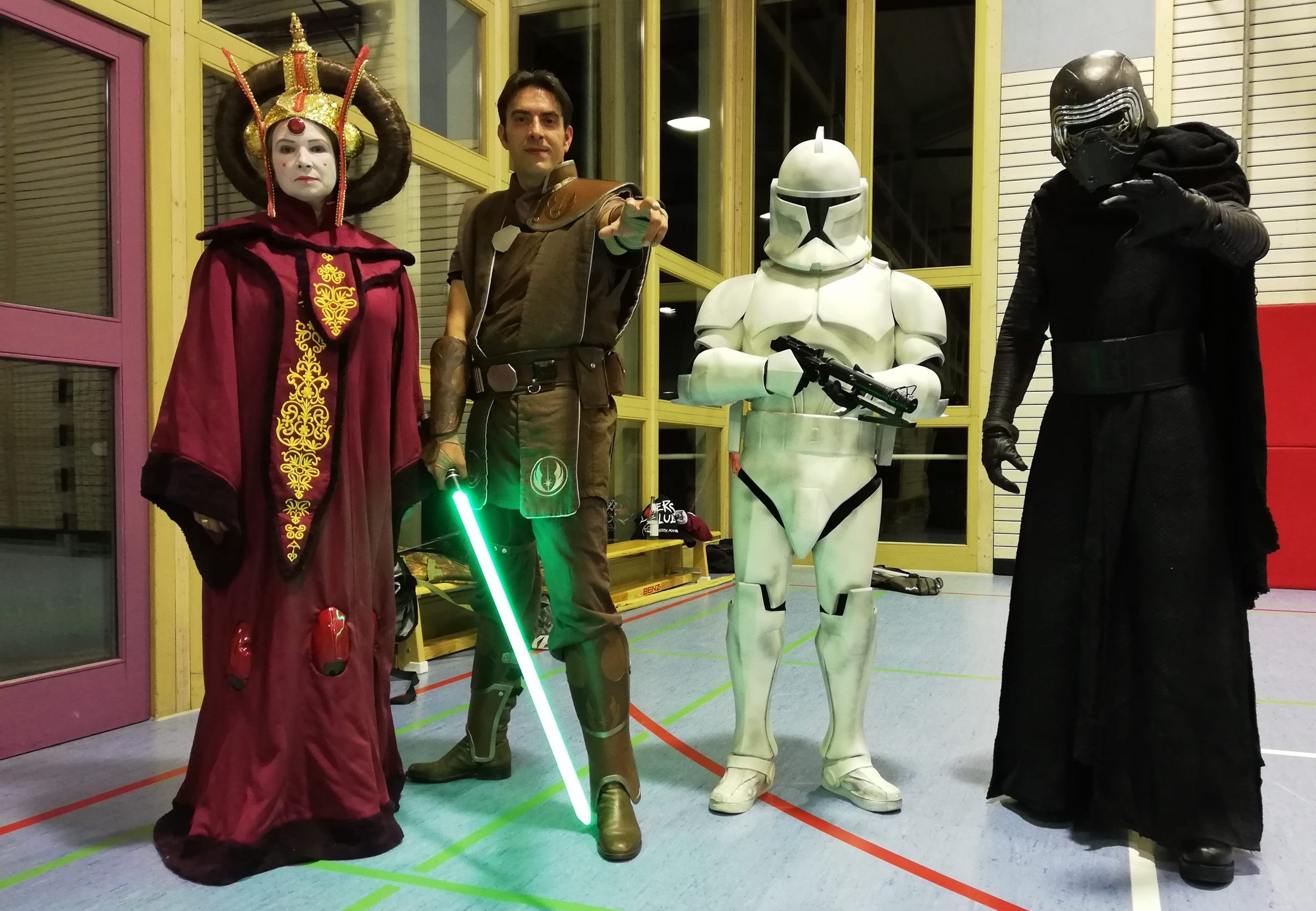 In der Gruppe habe jeder sein Steckenpferd, erklärt Reiner Götz. Er hat sich auf den Showkampf spezialisiert. Der unterscheide sich zum Wettkampf vor allem durch die Bewegungen, die eher weit und klar erkennbar sein sollten. Im Wettkampf würde das schnell das Aus bedeuten, denn hier gewinne der, der unberechenbar kämpft. Ein Showkampf benötigt eine gute Choreografie, die das Publikum zum Staunen bringt. Das sei der Gruppe bis jetzt immer gelungen, meint Götz. Oft hätten sie nach solchen Auftritten neue Mitgliedanfragen bekommen. Peter Preising ist einer von den Neulingen. Er kommt aus Backnang. Er lernte die Stauferlöwen Saber One in Stuttgart auf der Comic Con – der Messe für Comics, Videospiele und Popkultur – kennen. Sofort sei ihm klar gewesen, „da will ich dabei sein“. Seit drei Jahren mache er Cosplay im Star Wars Bereich. Cosplay, das sei mehr als nur ein Kostüm zu tragen. Bei dieser Spielart ist man jemand anderes, durch Kleidung, Schminke und Verhalten. „Cos“ stehe dabei für Kostüm und „Play“ für spielen. Die Kostüme stellt der 43-Jährige selbst her und trägt sie auf Conventions. Dafür reist er durch ganz Deutschland. Allerdings nicht alleine, dieses Hobby teilt er mit Freunden, er sei auch der Administrator des Star Wars Stammtisch Süddeutschland. Die Mitglieder treffen sich aller zwei Monate zum Fachsimpeln. Wenn er nicht gerade in die Rolle eines Jedi schlüpft, dann sichert er den Qualitätsstandard eines Stuttgarter Obst und Gemüsegroßhandels.