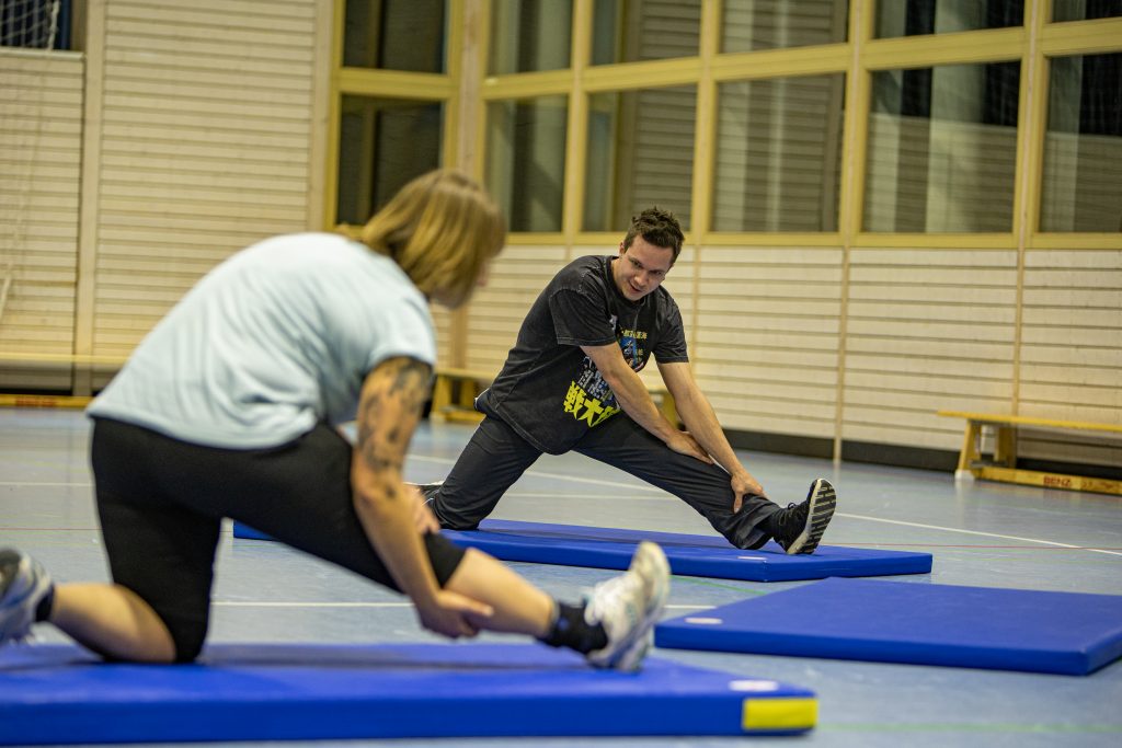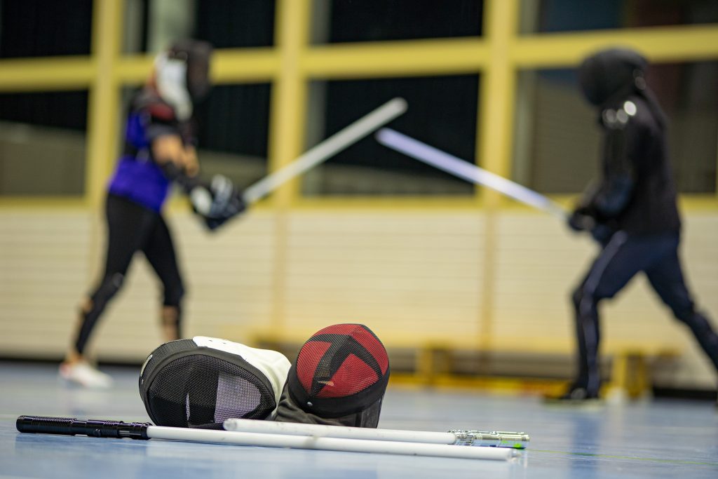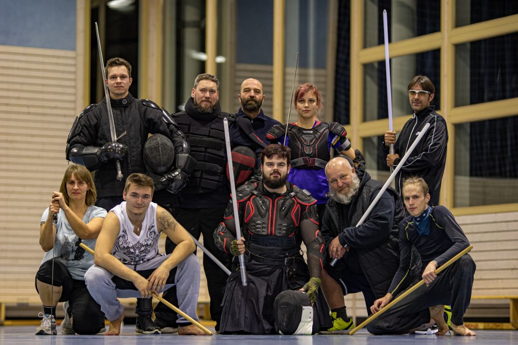 Nach einem Schlagabtausch im Training in der Bernhardushalle in Weiler nimmt Matthias Kaltenecker erst einmal seine Fechtmaske ab. Er muss verschnaufen und legt eine kurze Pause ein. Seit sechs Jahren sei er dabei. Er gehörte bereits der Jugendgruppe der Stauferlöwen an. Das Training gefalle ihm, weil es so anspruchsvoll ist. Christian Schieb, 21 Jahre alt, ist seit dem Frühjahr wieder dabei, es habe Zeiten gegeben in denen er jeden Tag einen Star Wars Film angeschaut hat. Dadurch konnte er die Dialoge schon auswendig und alle mitsprechen. Die gute Seele der Truppe ist William Ward. Der 57-Jährige nennt sich Gruppenopi. Mark Wamsler kenne er schon sehr lange, früher hätten sie gemeinsam Football gespielt. Das tolle an den „Stauferlöwen Saber One“ sei, dass sie auch Werte vermitteln. Der Lehrer Mark Wamsler denkt dabei an Rittertugenden, wie ehrenhaftes Verhalten, für einander Dasein und Nächstenliebe.